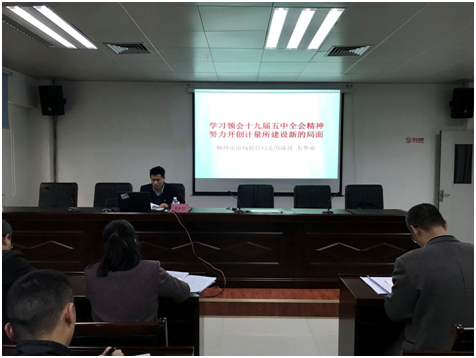 柳州市市场监督管理局党组成员韦华章同志为全体党员上了一节生动的党课。韦华章同志以“学习领会十九届五中全会精神,努力开创计量所建设新的局面”为主题,详细深入地阐述了十九届五中全会会议的概况和重要意义;全会关于“十四五”规划建议的说明以及我国新发展阶段的重要特征和全会释放未来中国发展的重要信号。