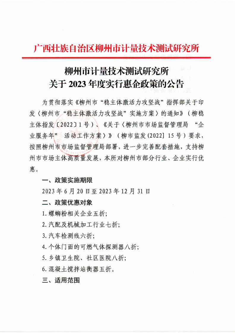 柳州市计量技术测试研究所关于2023年度实行惠企政策的公告